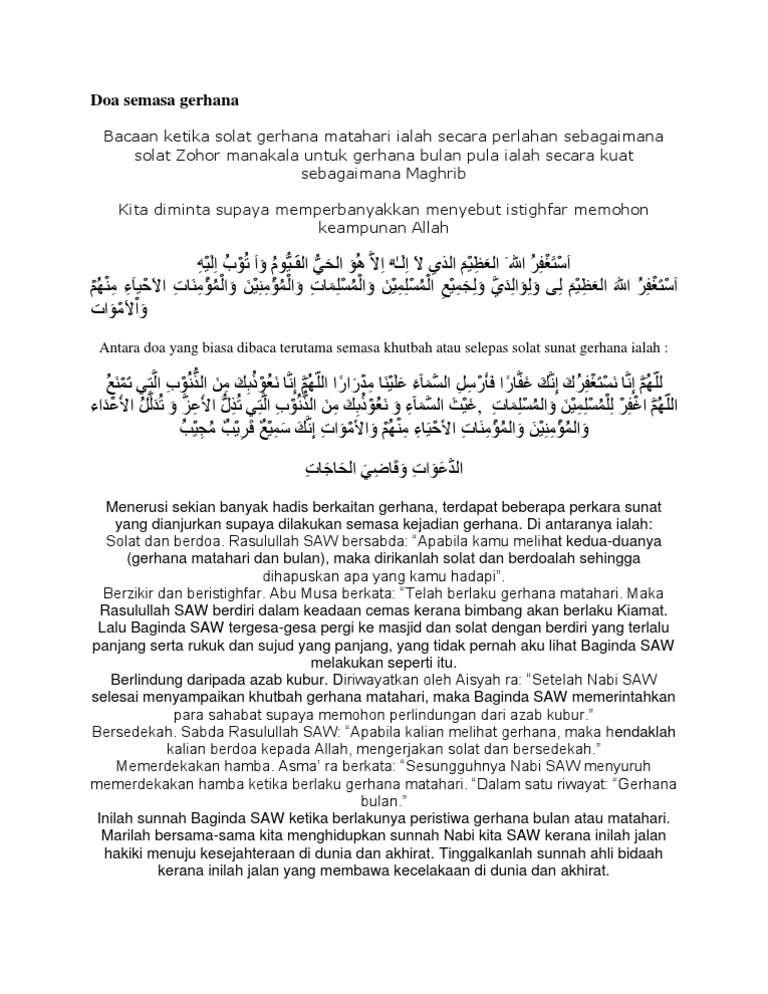 Doa selepas solat sunat gerhana matahari. Hukum Solat Gerhana Matahari Hukumnya adalah sunat muakkadah atau pun sunat yang digalakkan. Solat yang disebut solat Kusuf ini dilakukan sebanyak 2 rakaat saja yang mana tata caranya adalah sebagai berikut. Tidak dianjurkan kita untuk melihat gerhana tersebut tapi sebaiknya kita pergi ke masjid untuk melaksanakan sholat gerhana matahari.