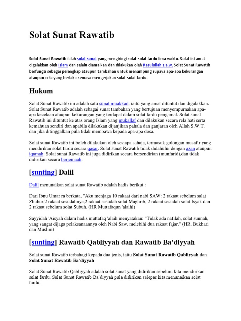 -Selepas memberi salamterus bangun lalu iqamat sekali lagi dan menunaikan solat qasar dengan niat. Sengaja aku solat fardhu Mahgrib tiga rakaat qasar kerana Allah Taala 14. Solat Sunat Rawatib ialah solat yang mengiringi solat-solat fardhu sama ada sebelum atau selepas solat fardhu.
