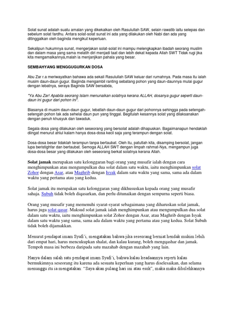 Tidak berniat bermukim melebihi 4 hari tidak termasuk perjalanan pergi dan balik. Solat Sunat Dhuha terkenal sebagai amalan pembuka rezeki dan membuatkan hati kita tenang sepanjang hari. Aku telah menghafal menjaga dari Nabi Muhammad saw tentang 10 rakaat solat sunat iaitu 2 rakaan sebelum solat zuhur dan 2 rakaat sesudahnya 2 rakaat selepas solat maghrib di rumahnya 2 rakaat selepas solat isyak di rumahnya dan 2 rakaat sebelum solat subuh.
